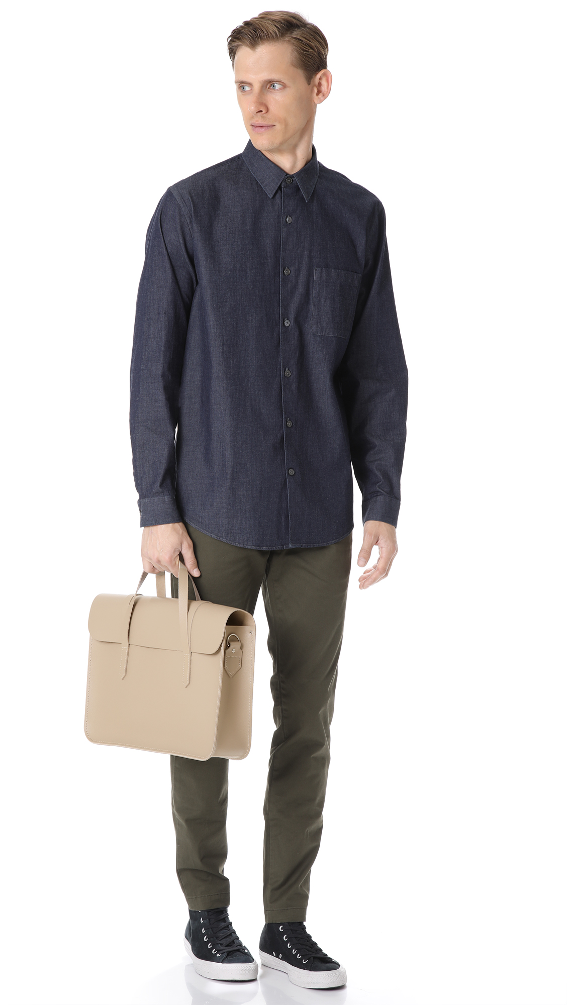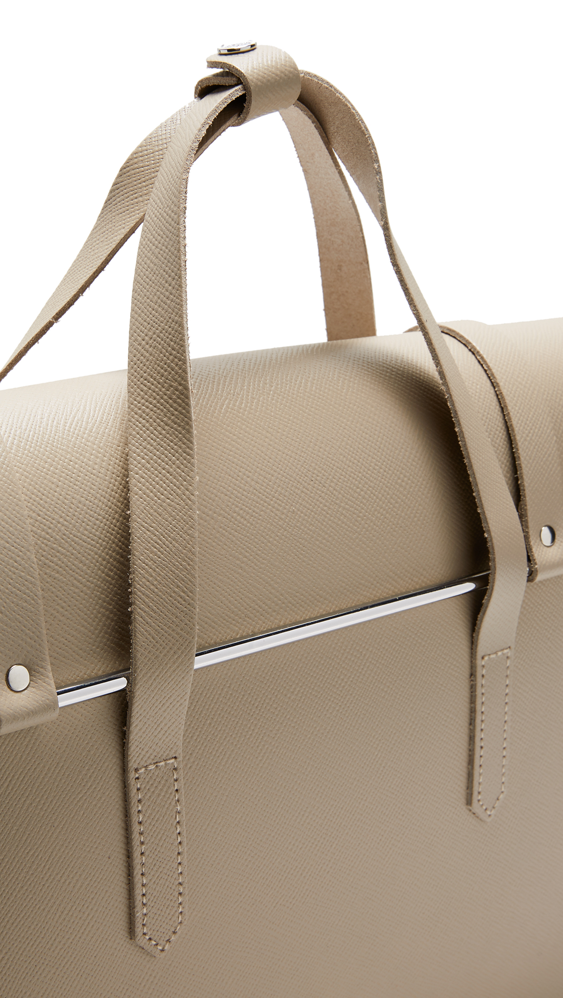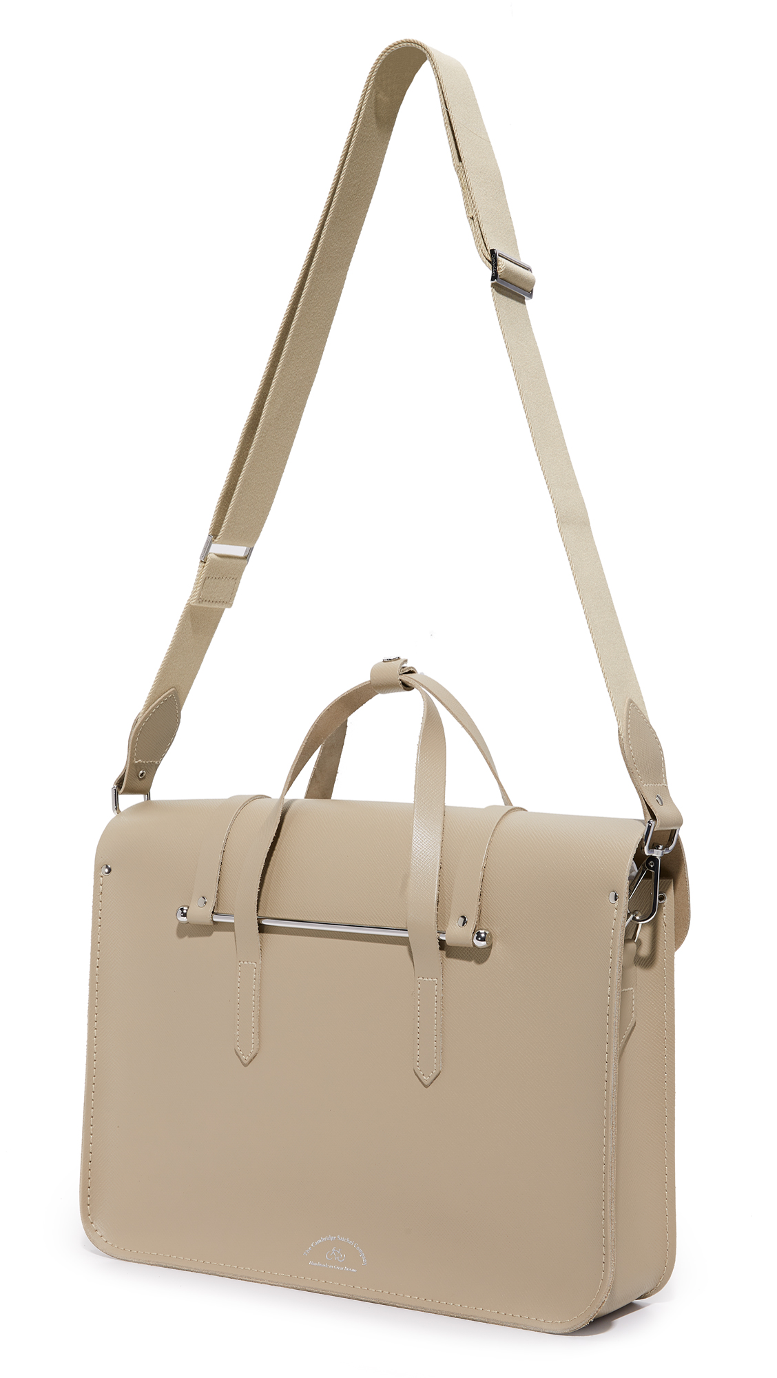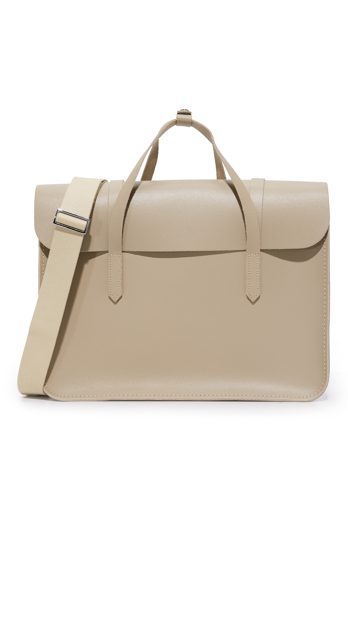 A saffiano leather Cambridge Satchel briefcase with a professional profile. A steel bar closure fastens the flap. Slim handles and optional, adjustable shoulder strap. Unlined. Dust bag included.