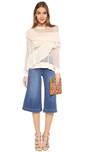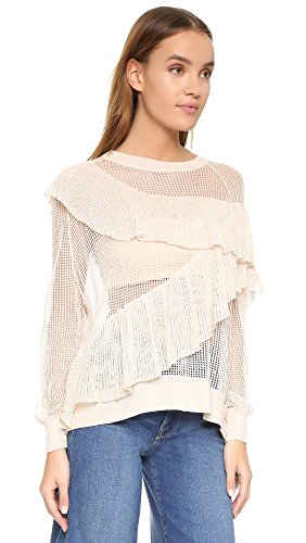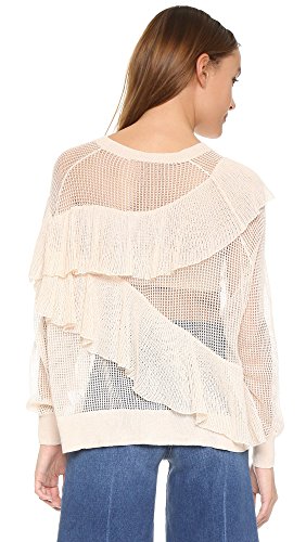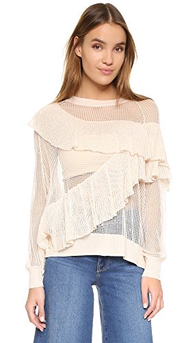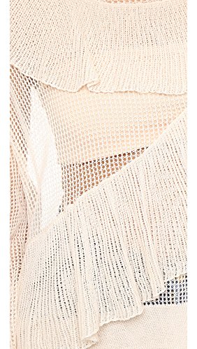 An open-knit Wildfox sweater with asymmetrical ruffles across the front and back. Ribbed crew neckline and edges. Long sleeves. Sheer.