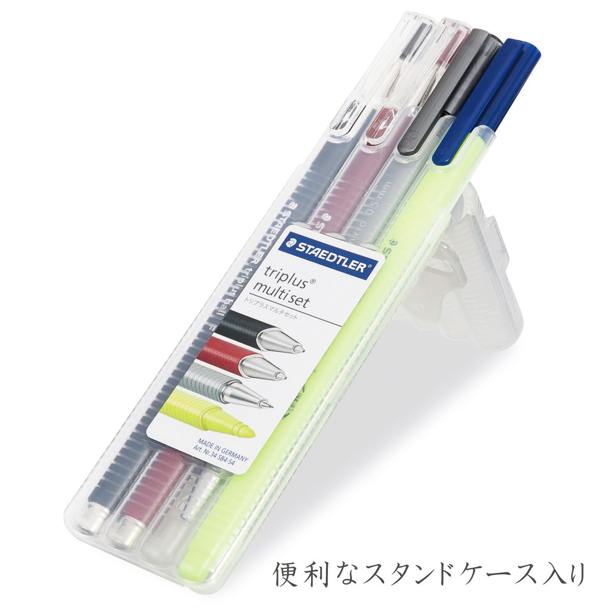Including highlighter pen (text surfer), tri plus ball black & red, triples micro, when it folded back the lid, it is convenient case to be put in the case, it is stored in the stooder box.