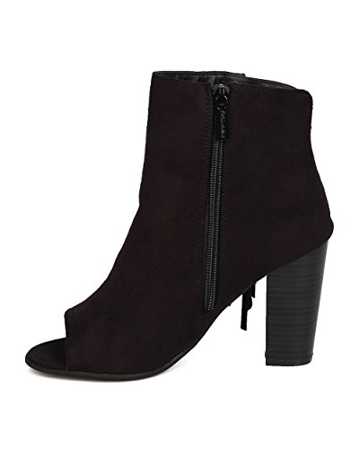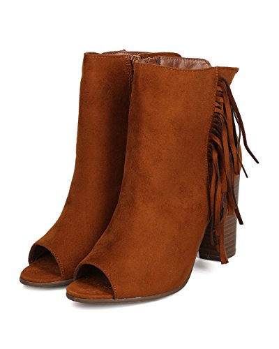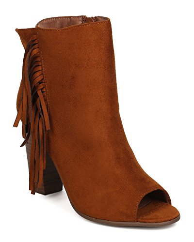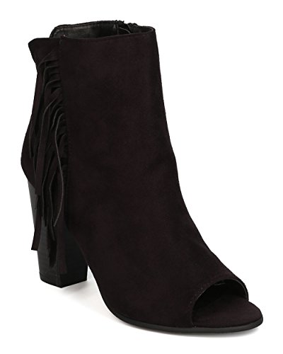 Product DescriptionThese trendsetting booties are made with a faux suede upper, peep toe and single sole. Also made with falling fringe detail on side panel, faux wooden chunky heel, and side zip for easy slip on and off.0