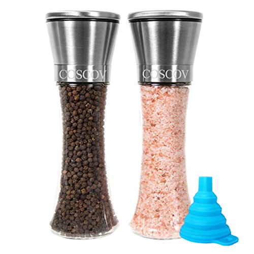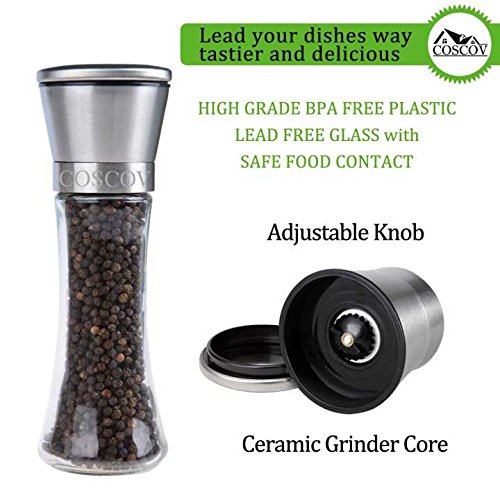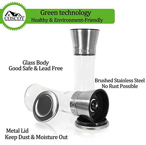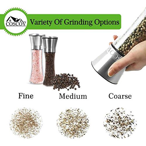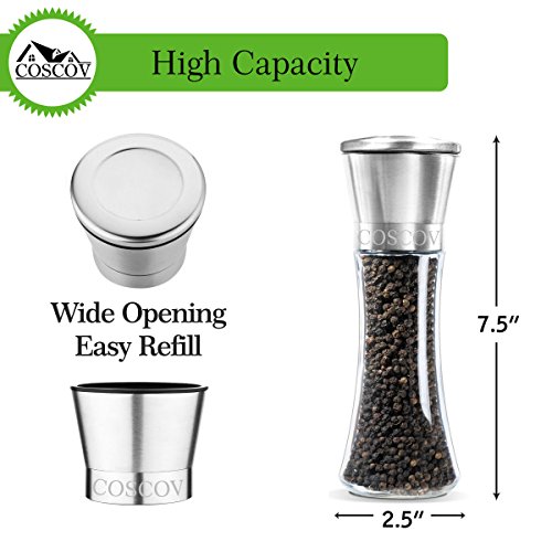 Coscov offers the original refined and premium quality salt and pepper grinder set, by crafted with a mix of stainless steel and glass, producing a durable and long service life. EASY REFILLING WITH NO MESSES--The clear glass bodies will let you know when its time to refill, and a wide opening for easy and mess free refills.