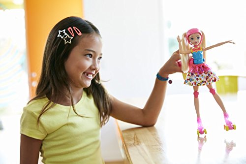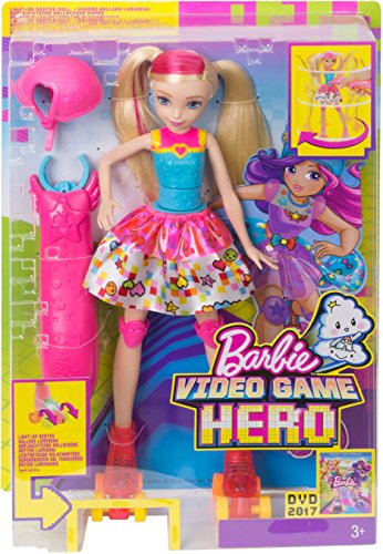 Be a game changer with Barbie doll! Inspired by Barbie Video Game Hero, Barbie Video Game Hero Light-Up Skates doll is ready to skate into the game! She wears her cool video game fashion from the movie and has working roller skates that light up as she skates. A matching handle clips around her waist so you control the racing action. Send her forward or backward -- or squeeze the handle to see her perform 360-degree spins. As she moves, her roller skates light up in multiple colors for a wow moment! She looks super cute wearing a brightly colored bodice with heart graphic and a white skirt with video game-inspired print and pink vinyl peplum. Pink kneepads and a matching removable helmet complete the signature look. Young gamers will love recreating favorite scenes or lighting up their imagination with roller-skating Barbie Light-Up Skates doll! Collect all of the Barbie Video Game Hero dolls for a full cast of video gaming characters (each sold separately, subject to availability). Includes Barbie Video Game Hero skating doll wearing fashions and light-up roller skates with rolling wheels, a helmet and a skate-and-spin tool. Doll cannot stand or roller skate alone. Colors and decorations may vary.Feature