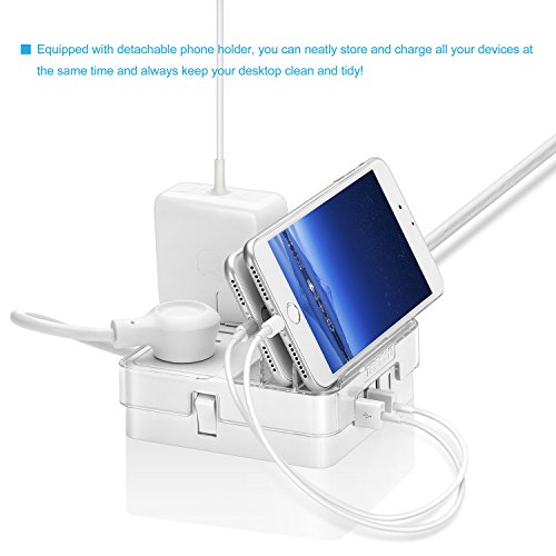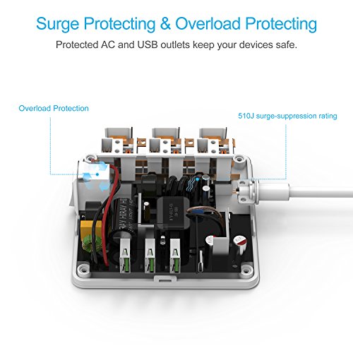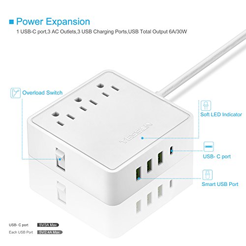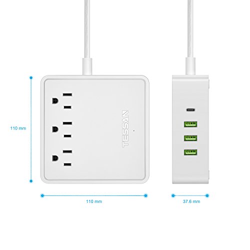 Studio : TESSAN Publisher : TESSAN Binding : Wireless Phone Accessory Product Description Product Specification: USB Input: AC100-250V ~50/60HZ 0.8 MAX Rated Power: 1250W-10A MAX 125V Energy Dissipation: 510J Spike Current: 15000A Response Time: 1NS Output per USB Port: 5V-2.4A MAX (Each Port) Output Type-C Port: 5V-3A MAX USB Total Output: 5V-6A 30W Material: Fireproof ABS material PC TESSAN 3 AC Outlets Surge Protector Type-C charging station The 3 outlet surge-protector offers ultimate convenience and protection for computer electronics, home entertainment systems, and more. With 3 USB Ports and 1 Type C port, it can charge Apple and Android phones, iPad, tablets, and other USB devices. Multi-protected Safety System With a 15000A max and 510J surge-suppression rating, the unit transfers optimal power and helps keep plugged-in devices safe, especially during storms and power outages.The Built-in power switch life is up to 6000 times, turns on/off as you need. TESSAN's multi protection safety system ensures complete protection from electrical short-circuit, over-heat, electric surge, over-charging, over-current and etc. Its beautiful chassis made of PC ABS plastic material makes it fireproof of up to 750 degrees. It also has synchronous rectification and current control; lightning protection and surge protection function. 3 High Power Super Charging Ports and 1 Type C Ultra powerful 3 ports USB and 1 Type C port charger up to 30W Integrated with Intelligent Charging technology that enables each port to detect and deliver ideal input current each time of up to 2.4A. Soft white LED indicator doesn't disturb your sleep. What is in the box 1 x TESSAN Surge Protector USB Charging station 1 x User Manual 1 x Service Card 0