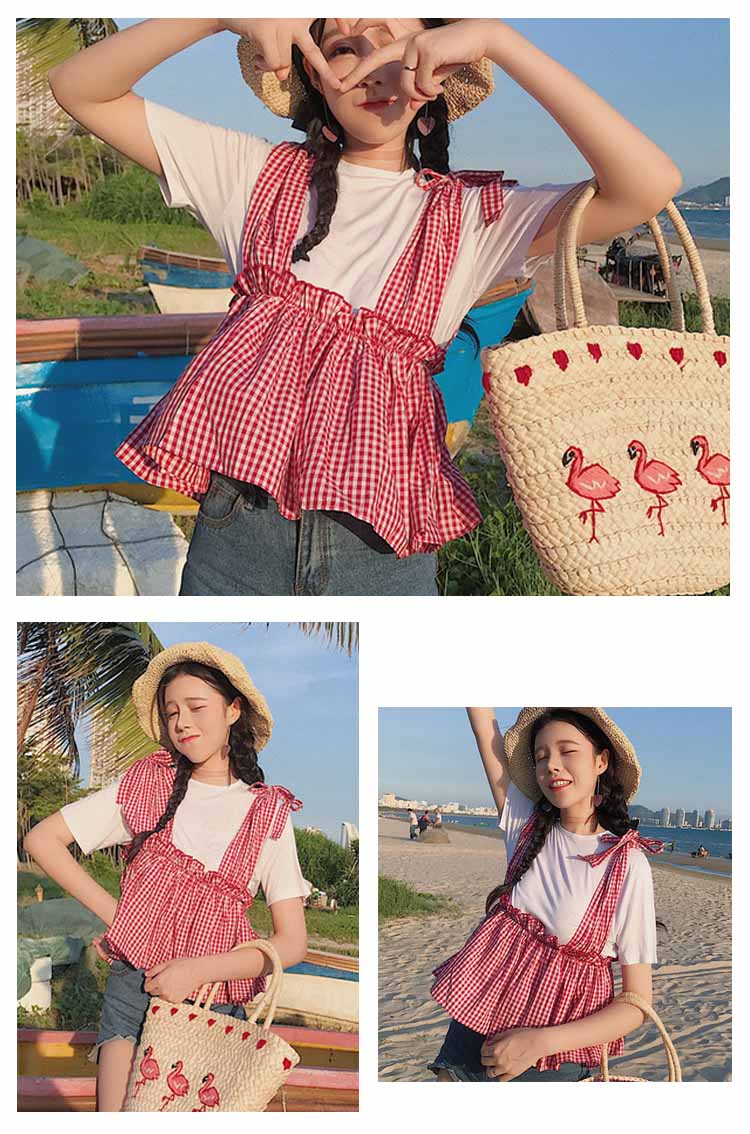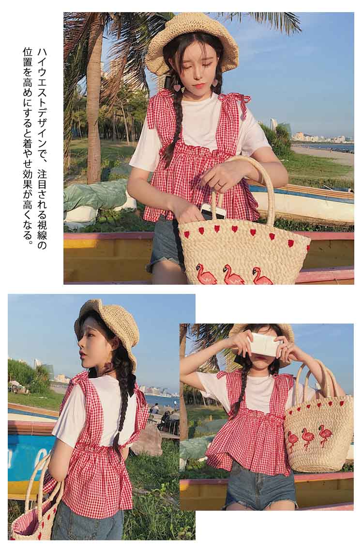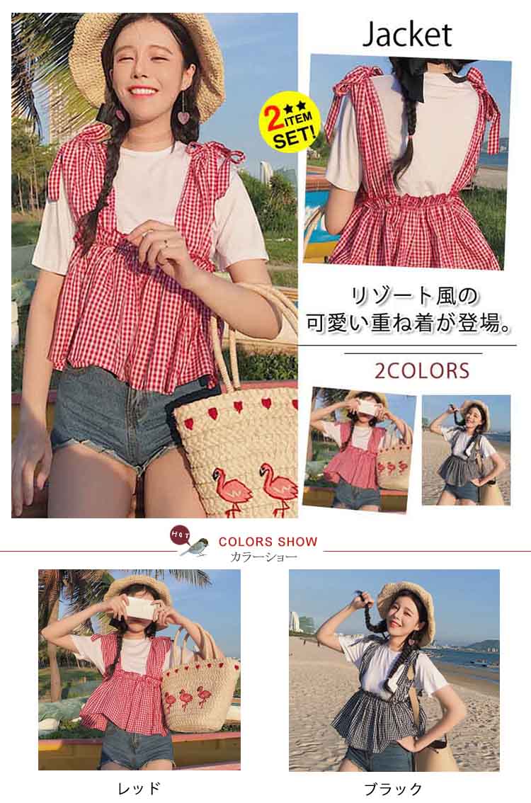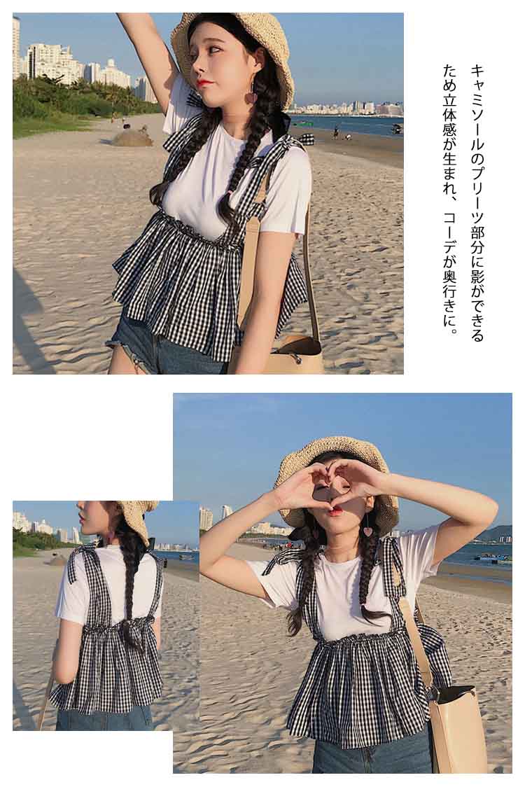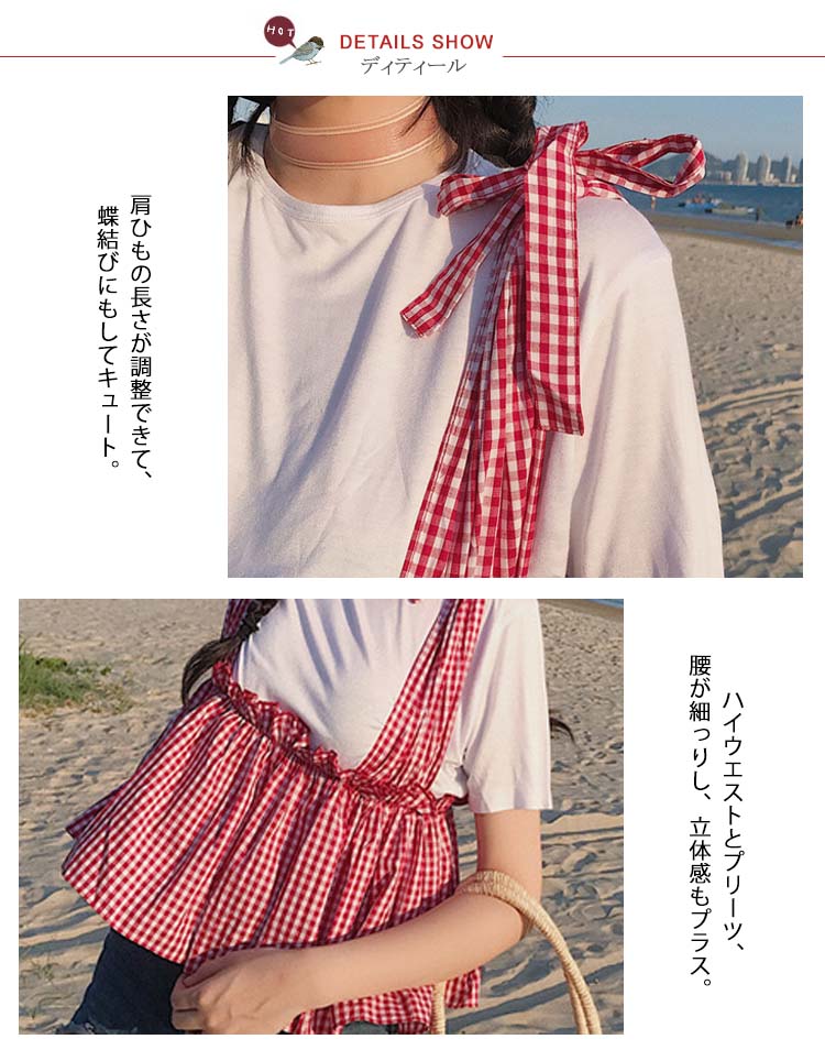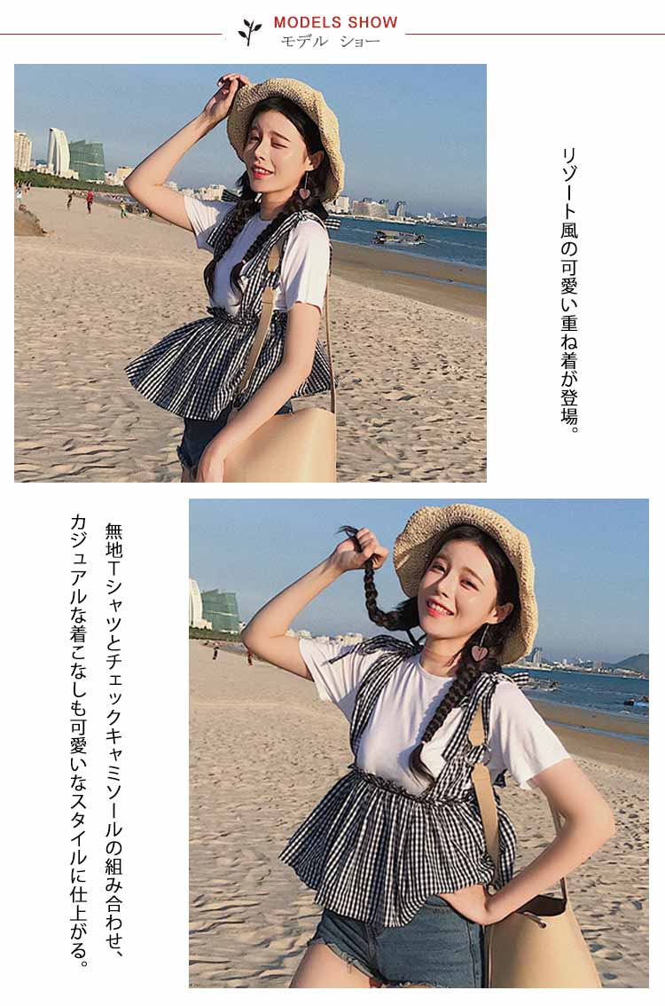 | リゾート風の可愛い重ね着が登場。無地Tシャツとチェックキャミソールの組み合わせ、カジュアルな着こなしも可愛いなスタイルに仕上がる。キャミソールのプリーツ部分に影ができるため立体感が生まれ、コーデが奥行きに。ハイウエストデザインで、注目される視線の位置を高めにすると着やせ効果が高くなる。女性たちの永遠のテーマ「着やせ」を完璧に演出できる一着。 | |
