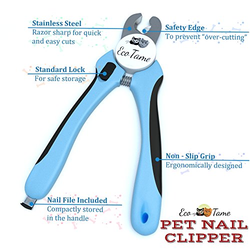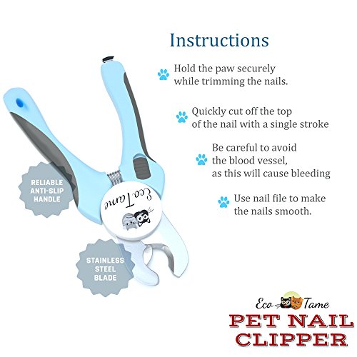 Studio : Eco Tame Publisher : Eco Tame Binding : Misc. Product Description Eco Tame Professional Pet nail clipper is the best pet grooming product on the market today. The ergonomic design and high quality materials provide durability and comfort during the use of this product. New improved head of the cutter allows you to use this product for all dog breeds from the smallest ones like Chihuahua to real monsters like Tibetan Mastiff. Our product provides smooth and safe nail removal procedure so you can be sure that your dog will be safe and won't be hurt during the nail grooming. INSTRUCTIONS: - Hold the paw securely while trimming the nails. Quickly cut off the top of nail with a single stroke. Be careful to avoid the blood vessel as this may cause bleeding.