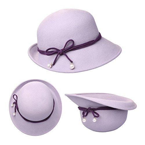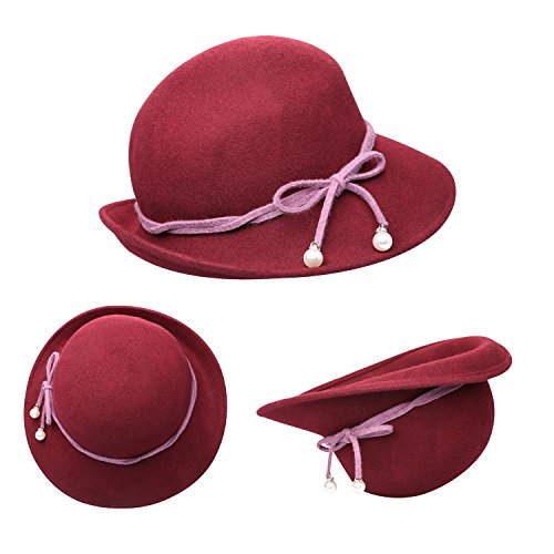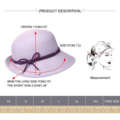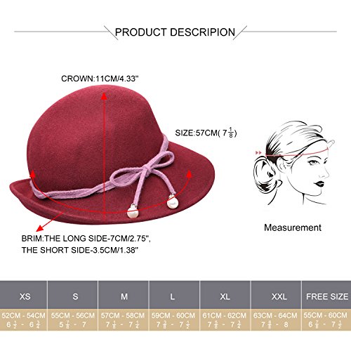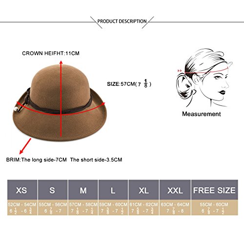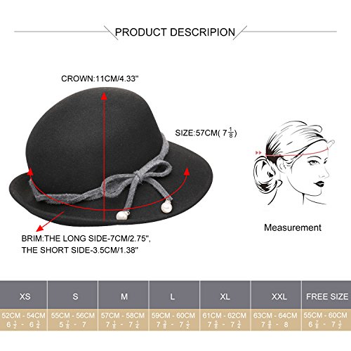 NOTICE: Due to differences between monitor displays, actual color may vary slightly from image. Because of manual and different measurement methods, pls allow 0-1/2inch difference due to manual measurement.Please kindly understand it. Thank you very much. Condition: 100% Brand New High Quality Wool Felt Fedora Sunhat Style: Thick and comfortable warm,Classic full dome Bowler Hat,Fashionable Roll Cloche Curling Cap Cowboy Hats,Panama Felt Fedora sunhats,Simple with Pendant Knotbow. The built in sweatband can effectively absorb sweat and protect the hat offers extra comfort Size: Cowboy Hats,Panama Felt Fedora sunhats Free Size Fits Most-Cirmerference:57CM/22.44",Brim:The long side-7CM/2.75",The short side-3.5CM/1.38",Crown:11CM/4.33". Washing instruction: We suggest a hand wash with cool water and mild soap,then remember to line dry. Occasion: Felt Fedora Cowboy Sunhats,Panama hats Brilliant for special occasions and formals affairs like derbies, weddings, prom, date night, dapper day at Disney, and more; Unisex style looks classy feminine on the ladies yet handsome suave on the gentlemens. Classic Women Wool Felt Hats for both indoor and outdoor vacations,such as camping,climbing,travel,holiday,shopping,party,taking pictures or just decoration. Season: Felt Fedora Cowboy Hats,Panama sunhats for Spring, Fall and Winter. GUARANTEE: For this wool felt fedora Sunhat,We stand by our products with excellent customer service and a 90-day warranty. If you have any questions, please feel free to contact us and we will reply you kindly and instantly