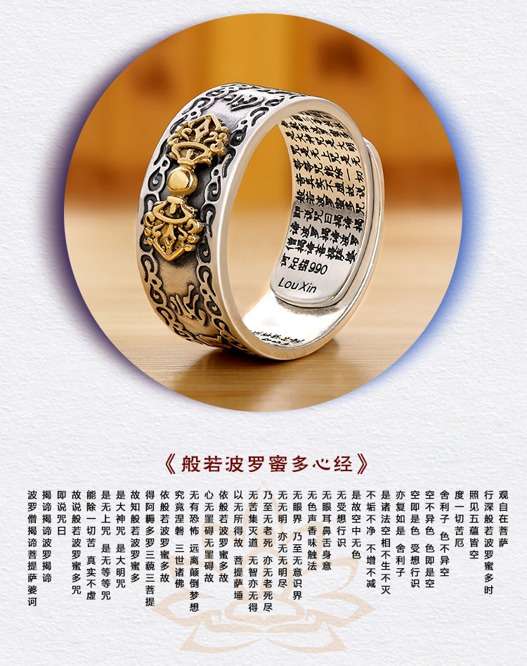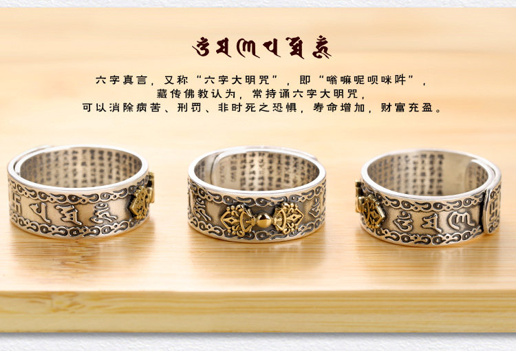 99足银金刚杵六字真言心经戒指纯银男士霸气复古开口潮男个性辟邪