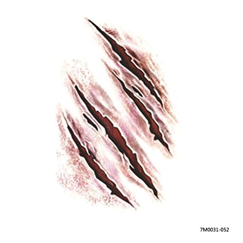 -. Feature : Waterproof men women halloween funny 3d scar decal face body art makeup. / Scar seems very true and nature. / Wet the tattoo with a sponge or water directly. After 20-30 seconds, gently remove the backing paper.Allow the tattoo to dry. / Apply for school boy girl men and women, easy put on and take off. / Halloween gift and tricking,it will not harm the skin.