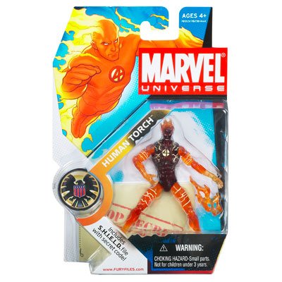 Studio : Hasbro Publisher : Hasbro Binding : Toy Product Description This super-poseable 3 3/4-inch scale action figure from Hasbro features the superhero, the Human Torch. The figure is translucent and comes with an orange flame and a S.H.I.E.L.D. file with a secret code. 0