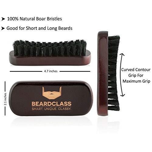 BEARDCLASS Wooden Beard Brush is made 100% Boar Bristles which are perfect for long and short beards and extremely gentle on the skin at the same time. Dimensions: 4.7 in x 2.1 in The brush has a Curve Contour Shape for maximum grip on the beard.
