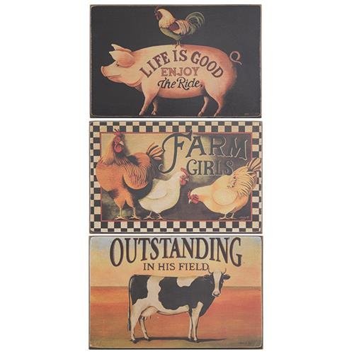 Set of 3 Farm Signs Pig Rooster Chicken Cow Farm Girls - Each is 4 x 6 - Country Kitchen Charm Rustic Primitive