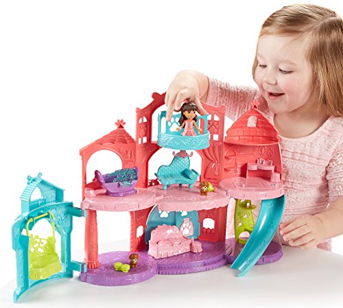 Journey to the Puppy Palace with Dora and Friends! This precious pet playset comes with Dora, Perrito, a kitty and lots of accessories to create a day of play with the pets! Pretend to bathe the pets in a bubbly tub, play on the swing or take a ride down the slide! You can peg the Perrito & kitty figures onto the playroom rug and turn the wheel to see them spin and playfully chase each other! This brightly-colored palace also features fun details like a spinning balcony, a doggie door and a cat climbing tower! Includes palace playset, Dora, Perrito, kitty, bubbly tub, bath towel, vanity, bed, couch, food bowl and a palace crown the pets can wear! Ages 3+.