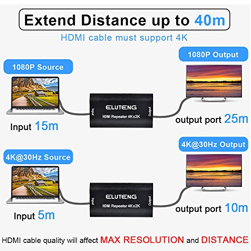 Full HD 1080P This Extender Supports HD Resolution up to 1080P, Give you a Great Picture, Support 4K 30Hz, extend distance up to 40 meters(Input port 15m, output port 25m). Not support 4K 60Hz.