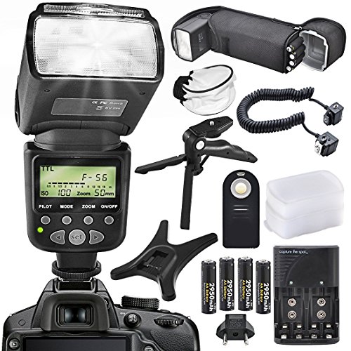 Accessory bundle includes an AA battery with compatible charger, 3 Ft. off-camera flash cord, universal remote, hand grip handheld tripod, universal diffuser, and flash pouch