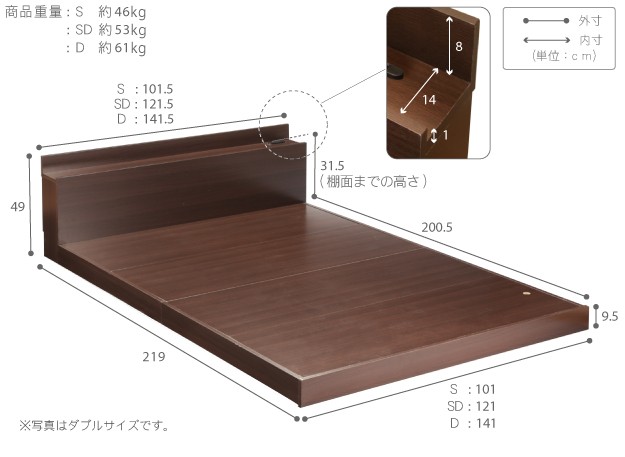 ●[ベッド]幅121.5×奥行219×高さ49(床板高さ9.5)cm・約53kg