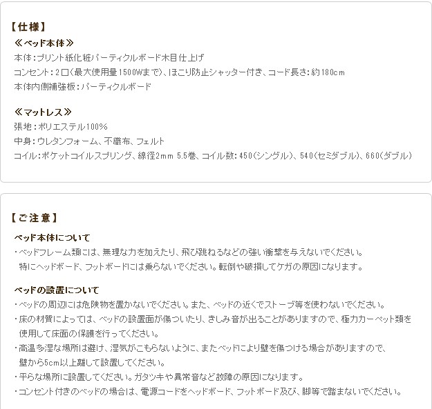 ●セミダブルサイズ ポケットコイルマットレス付き コンセント付き ローベッド