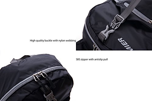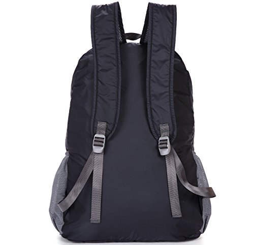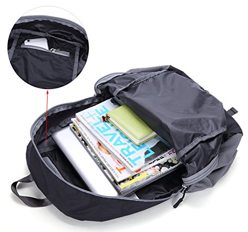 -. Feature : Water Resistant Backpack ---- Made of diamond ripstop nylon, durable and stronger. Perfect for cycling trips, jogging, fishing, hunting camping, gym, travel, school and great gift for everyone / Comfy to Wear ---- 2.4" width shoulder straps and mesh material make it very comfortable and breathable, didn't dig into your shoulders even with a heavy load / Carry On Backpack ---- Unfold as 12" L x 7.5"D x 18"H, fold size is 6"L x 1.5"D x 6"H. Easily folds inside the inner pocket for compact carrying or storing under a front airline seat carefully, or putting in your suitcase / Multi-Pocket Daypack ---- 1 large main compartment, 1 interior pocket, 2 side mesh pocket, 1 small outside zipper pocket, 1 front deep pocket with snap release buckle / Well-Crafted ---- Ultralight(only 0.4pound), Solid stitches coupled with reinforced treatment on stress point prevent unexpected break off. Nylon web is also stronger and lightweight than polyester one, SBS zipper has a stable smooth performance