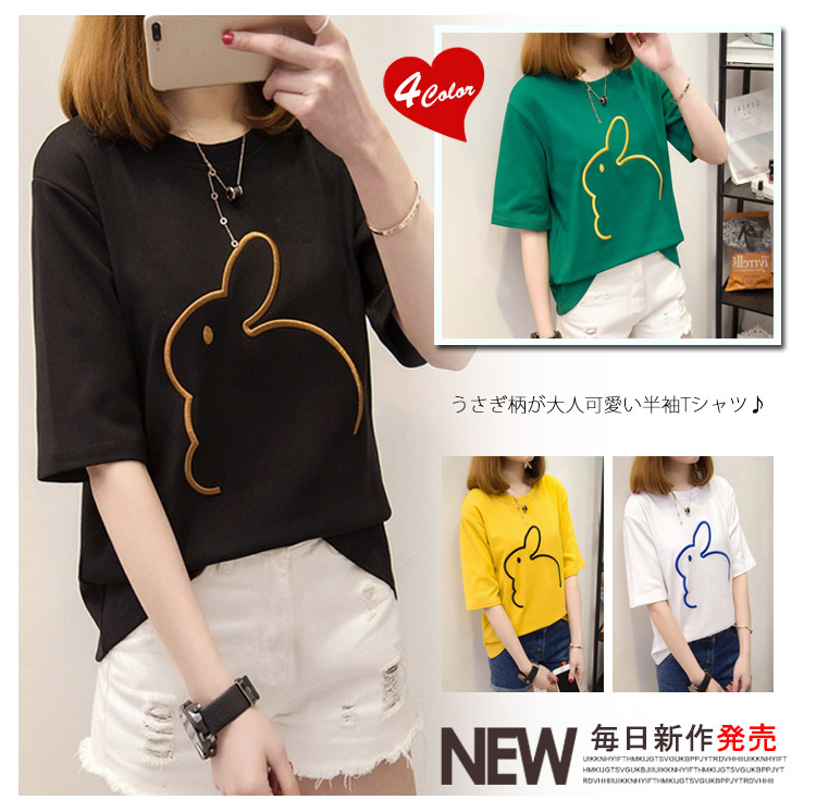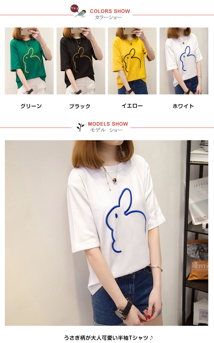 | うさぎ柄が大人可愛い半袖Tシャツ♪ベーシックカラーから鮮やかカラーまで4色展開で、コーデの幅が広い4Lまで展開でマタニティウェアとしても着用いただけるのが嬉しいPoint!シンプルでショートパンツやスキニーなどいろんなボトムスと好相性!お手頃の価格ですから、色違い揃えたくなります | |