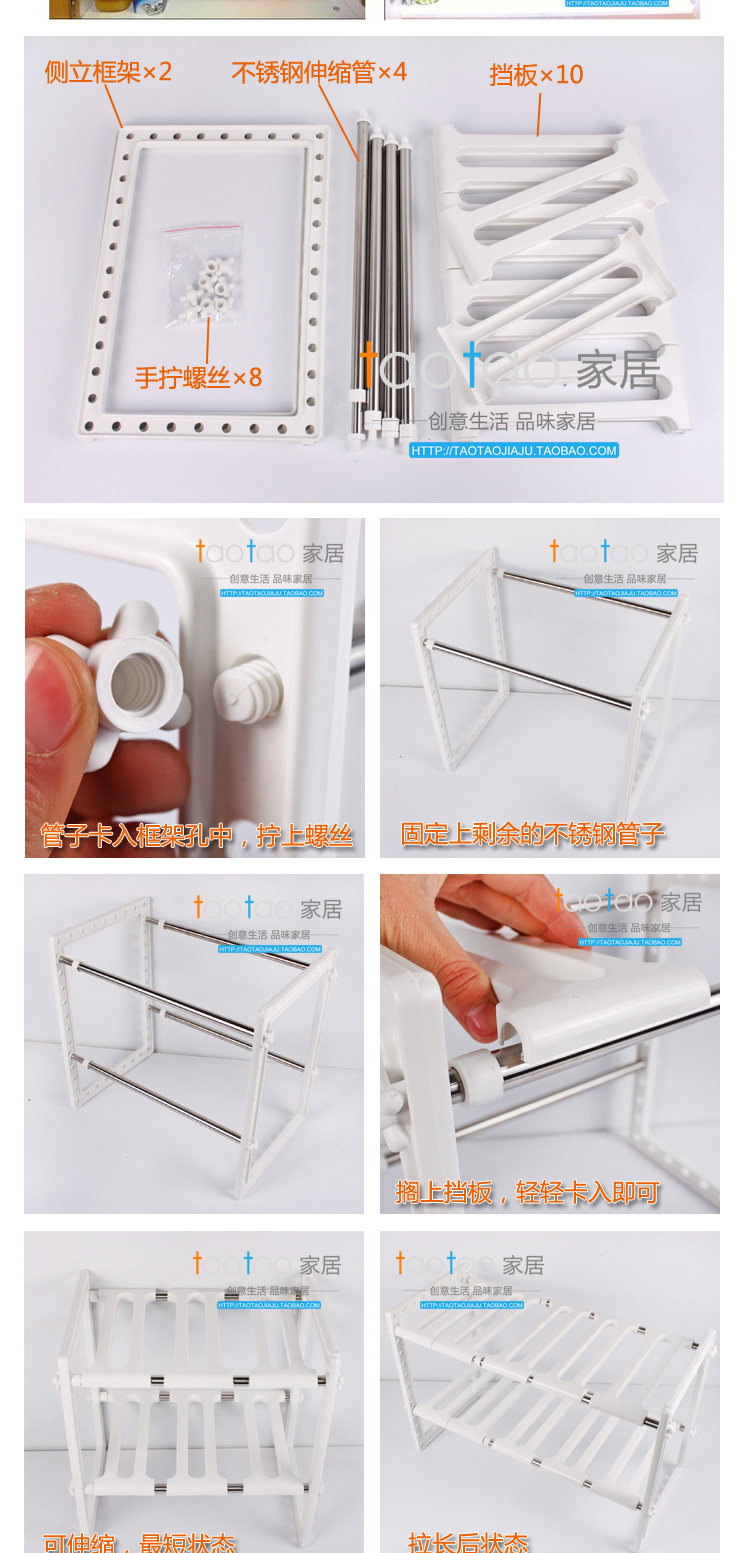 概述:外观美观大方,精巧耐用,可收纳碗碟厨具杂物等。节省空间!安装防止在水槽底下,有效的利用空间,居家收纳好帮手,也可以做鞋架等家居用品整理收纳架!