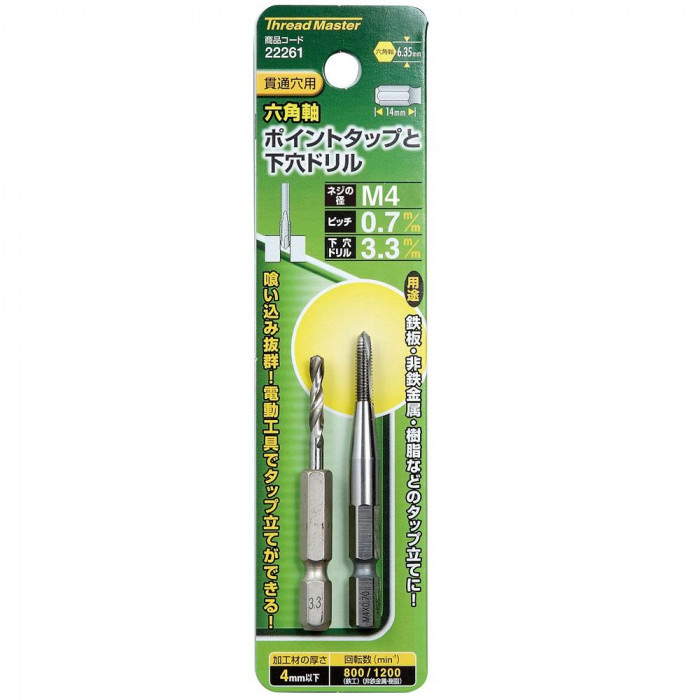 | 仕様 | 【使用電動工具】 ボール盤(下穴ドリルのみ) 充電式インパクトドライバー 高トルク型正逆回転機能付き電動ドリル 高トルク型充電式ドリルドライバー ※六角軸ポイントタップは六角軸専用タップハンドルでご使用ください。 |