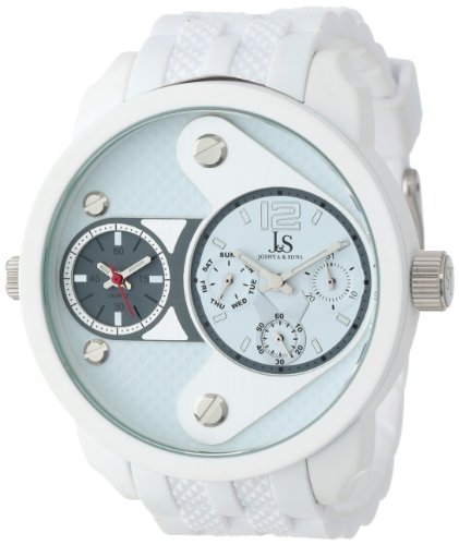 -. Binding : Watch -. Brand : Joshua & Sons -. Department : mens -. EAN : 0848572023412 -. Feature : Round white watch with 52mm metal case and pale blue mineral dial window / Swiss quartz movement with analog display / Featuring silver-tone screws at face, fluted crown, chronograph subdials, and textured white plastic band with buckle closure / Water resistant to 99 feet (30 meters) -. IsAdultProduct : 0 -. Label : Joshua & Sons -. Manufacturer : Joshua & Sons -. Model : JS52WT -. MPN : JS52WT -. PackageQuantity : 1 -. PartNumber : JS52WT -. ProductGroup : Watch -. ProductTypeName : WATCH -. Publisher : Joshua & Sons -. ReleaseDate : 2013-09-26 -. Studio : Joshua & Sons -. Title : Joshua & Sons Men's JS52WT White Metal Watch with White Band -. UPC : 848572023412