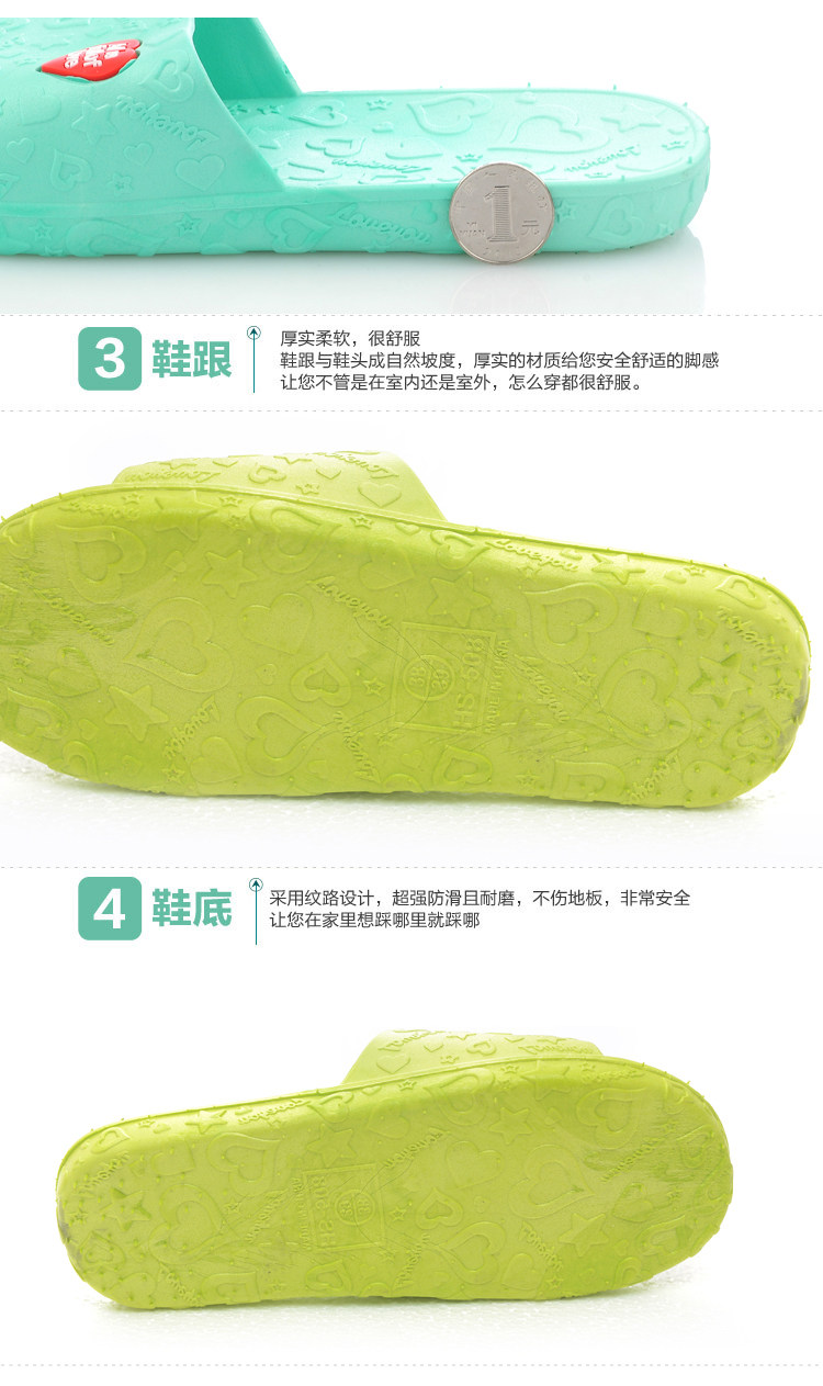 概述: 可做浴室拖和春夏户外凉拖;多彩时尚,落地轻柔,轻便透气,采用高密度PVC新料,鞋底独特爱心纹路设计,超强防滑且耐磨,非常安全,让您在沐浴时不用担心脚底!
