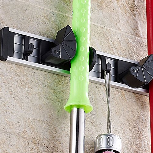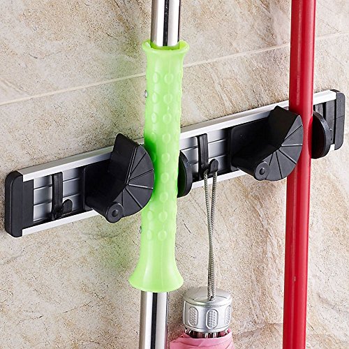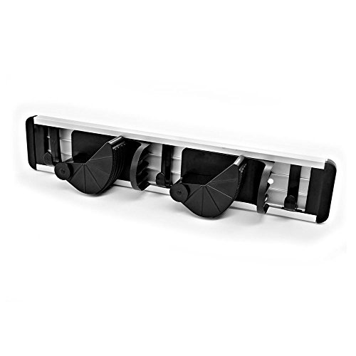 2 pcs broom holders in a package. Each holder has 2 friction-grips and 3 hooks to hang cleaning utilities, sports equipments and more