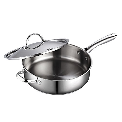The Cooks Standard 5 quart/11-inch classic stainless steel deep saute pan with lid is made with stainless steel with an aluminum disc layered in the bottom. The aluminum disc provides even heat distribution and prevents hot spots. Stainless steel lid keeps in heat and moisture. Riveted handles offer durability and stay cool. Induction compatible. Works on gas, electric, ceramic, glass, etc. Oven safe to 500F. Dishwasher safe.Feature