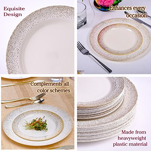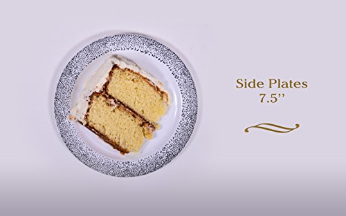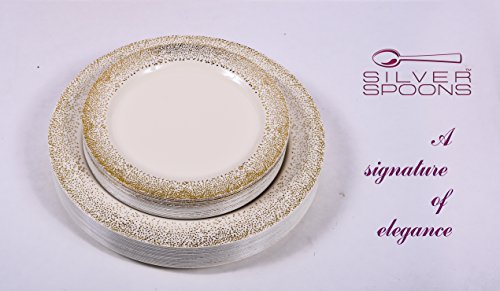 Product features: 7.5" ivory with gold border side plates 100% and non-toxic. Made from high-grade heavyweight plastic material. Sturdy plates won't easily snap, sag, or break designed with wide rims to avoid spills. Durable to use and handle. Leak free, soak-proof, cut resistant and unbreakable. Resists any sharp object. Crafted to carry heavy food items and to handle hot and cold dishes. High-end look at an affordable price