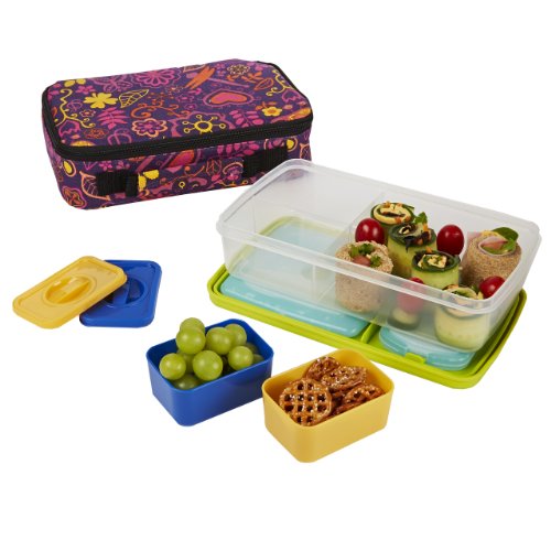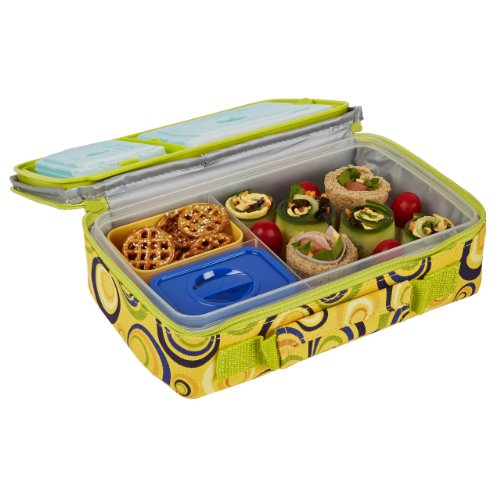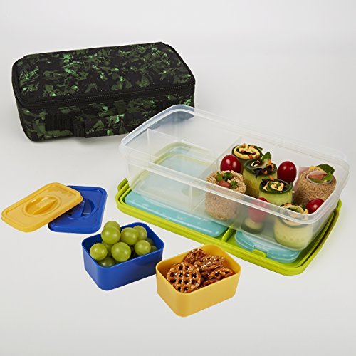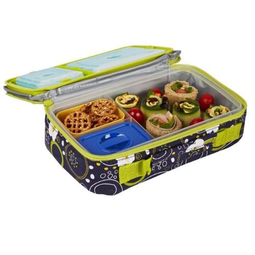 This bento lunch kit is perfect for your little ones on the go. Kit has one main container with a sandwich sized compartment and two smaller compartments. The two smaller compartments each hold a small half cup container. The main container lid holds two ice packs to keep your child's meal fresh and cool for meal time. The whole kit comes enclosed in an insulated chiller bag in awesome prints your child will love! plastic containers are microwave, freezer, and top rack dishwasher safe. Inner bento pods are removable, and includes (1) blue and (1) yellow. Kit includes: large bento container with lid, (2) small bento pods, (1) lunch pod sized ice pack, (1) 2 cup sized ice pack and (1) insulated bag. Lid of large container features a TPE lip making it easy for your child to open.