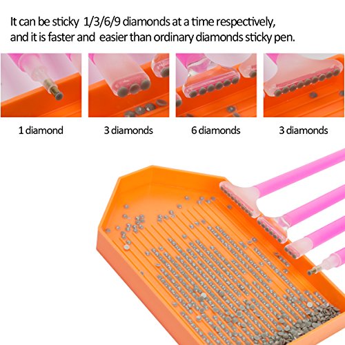 - DIAMOND STICKY PENS: 3 types of diamond sticky pens (2 x 3 diamonds, 3 x 6 diamonds,3 x 9 diamonds) can be sticky 3/6/9 diamonds at a time respectively, and it is faster and easier than ordinary diamonds sticky pen.