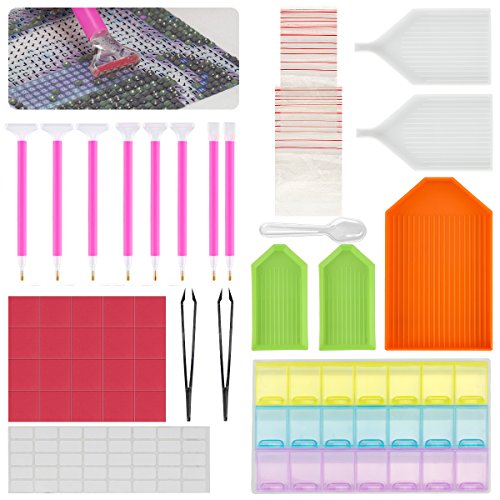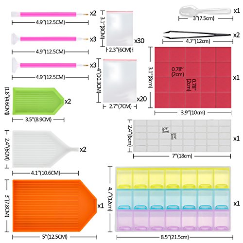 - STORAGE BOX AND PLASTIC BAGS:There are 21 compartments plastic storage box, 20 large plastic bags and 30 small plastic bags for you to organize different colors diamonds easily and found the color your want.