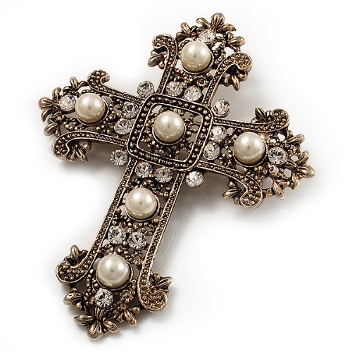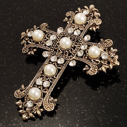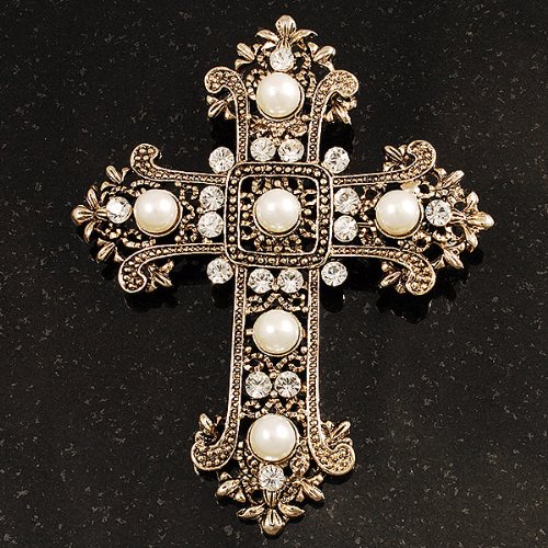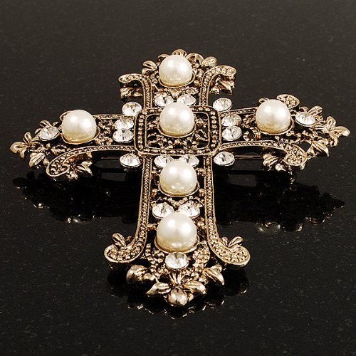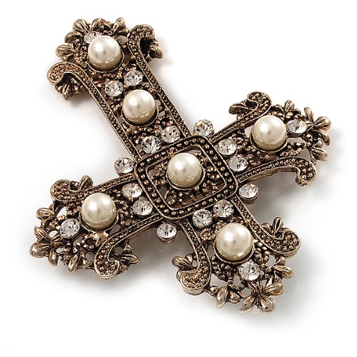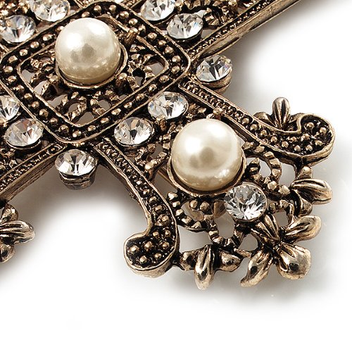 -. Title : Large Victorian Filigree Imitation Pearl Crystal Cross Brooch (Antique Gold)