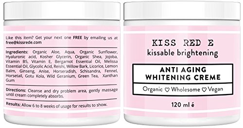 -. Binding : Misc. -. Brand : Kiss Red E -. EAN : 0641427816999 -. Feature : #1 Rated Skin Whitening Cream. Anti Aging Skin Lightening Cream with safe and effective ingredients that nourish and renew your skin. / Brightening Cream for that even balanced skin tone and also gives you that youthful glow. / MADE IN USA Formulated and manufactured in United States. / AGAINST ANIMAL CRUELTY - We love animals and do not test on them. -. IsAdultProduct : 0 -. Label : Kiss Red E -. Manufacturer : Kiss Red E -. MPN : KRE-20181301 -. PackageQuantity : 1 -. PartNumber : KRE-20181301 -. ProductGroup : Beauty -. ProductTypeName : BEAUTY -. Publisher : Kiss Red E -. Studio : Kiss Red E -. Title : Whitening Cream. Anti Aging Skin Lightening Cream. Hyaluronic Acid, Vitamin C, Glycolic Acid. Best Day Night Moisturizing Cream. 4 Oz -. UPC : 641427816999
