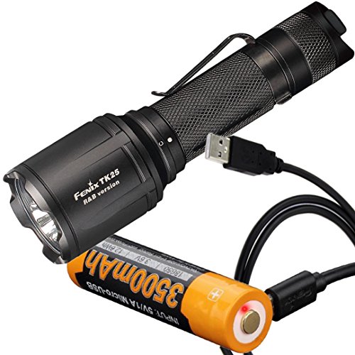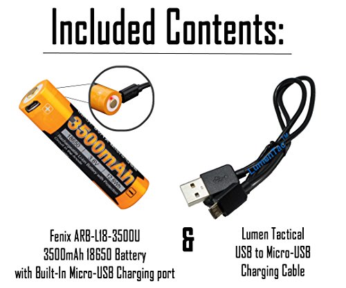 - HIGH CAPACITY RECHARGEABLE BUNDLE – Fenix TK25 R&B Multi-Color Tactical Flashlight, Holster, Lanyard, Removeable Belt Clip, Spare O-rings, Fenix ARB-L18-3500U 3500mAh high capacity 18650 Battery with built-in Micro-USB port, & LumenTac USB to Micro-USB Charge Cable so you can charge your battery on-the-go without the need of a separate external charger!