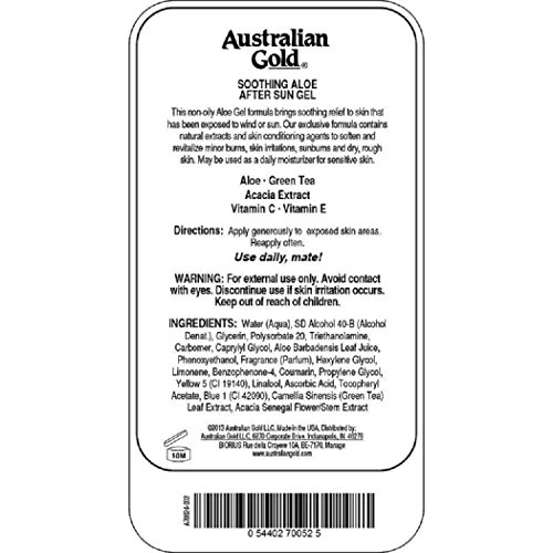 Australian Gold soothing Aloe After Sun Gel A well cared for and nourished skin stays tanned longer! Soothing Aloe Gel is able to give an immediate feeling of freshness and help irritated skin from the sun to quickly normalize. A well cared for and nourished skin stays tanned longer! Soothing Aloe Gel is able to give an immediate feeling of freshness and help irritated skin from the sun to quickly normalize. Recommendations for use: The application is extremely simple and the absorption of moisturizing components, by the skin nutrients and soothing is speeded SPF Spray Gels. Particularly suitable for reddened skin and sunburn. Features: - Formulated with aloe, vitamin E and panthenol - Natural extracts + acacia extract - keep refrigerated to accentuate the refreshing powerFeature