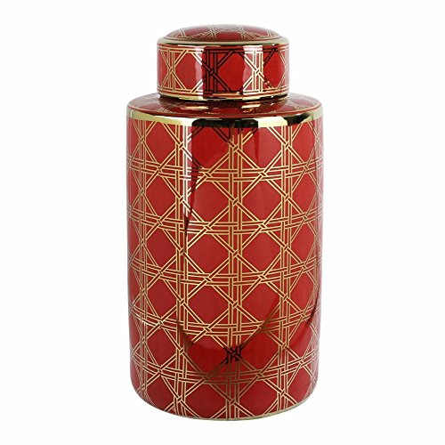 Benzara Decorative Geometrically Patterned Ceramic Covered Jar, Red & Gold