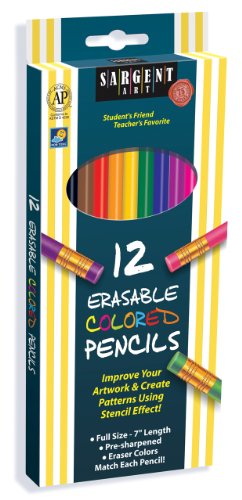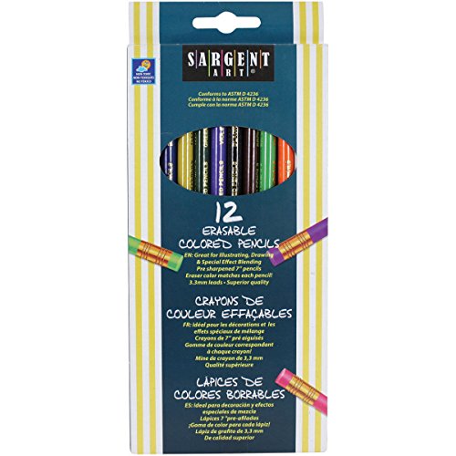 -. Artist : Accessory -. Binding : Kitchen -. Brand : Sargent Art -. EAN : 0042229272035 -. Feature : Set of 10 erasable colored pencils are more versatile than standard pencils / Child-safe non-toxic formula in a rainbow of bold, vibrant colors / Smooth, round shafts are easy to hold; matching colored eraser / Full-size 7-inch length; pre-sharpened for immediate use / Packaged in reusable box with see-through window -. Label : Rejects from Studios -. Manufacturer : Rejects from Studios -. Model : 22-7203 -. MPN : 6197340 -. NumberOfItems : 1 -. PackageQuantity : 1 -. PartNumber : 6197340 -. ProductGroup : Art and Craft Supply -. ProductTypeName : HOME -. Publisher : Rejects from Studios -. ReleaseDate : 2015-10-21 -. Studio : Rejects from Studios -. Title : Sargent Art 22-7203 Assorted Erasable Colored Pencils, 12 Count -. UPC : 042229272035