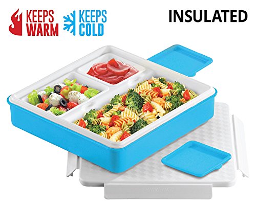 INSULATED BENTO LUNCH BOX - PINNACLE BENTAGO THERMO SLIM DESIGN, TRAY STYLE FOOD CONTAINER – LEAKPROOF - 3 COMPARTMENT PORTION CONTROLL – For Adults And Kids – Blue