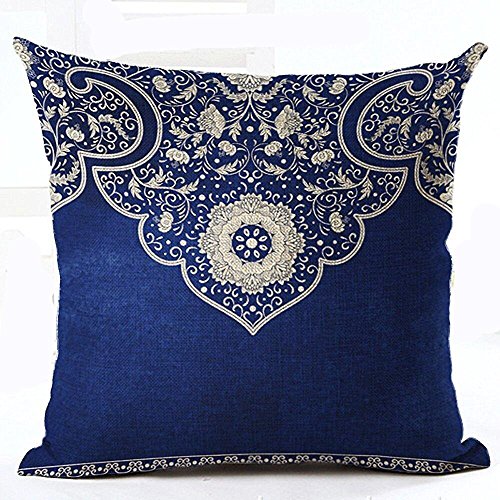 Cotton Linen Square Decorative Throw Pillowcase Cushion Cover Retro style blue and white porcelain Bohemian floral design Dark blue background 18 "X18 " (Boho floral)