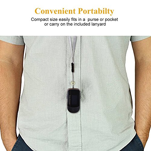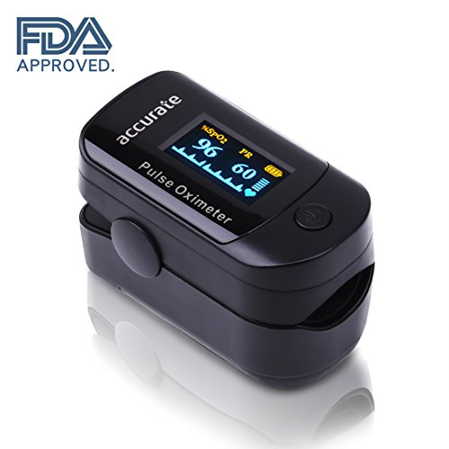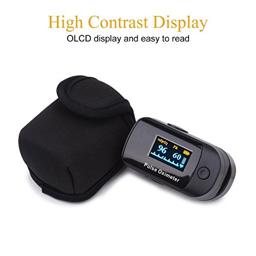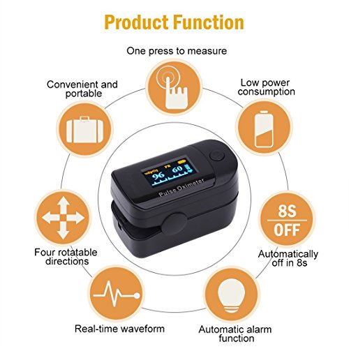 -. Feature : FDA APPROVED & Advanced Accuracy - This finger pulse ox utilizes advanced pulse oximetry to ensure the most consistent and reliable results. SpO2 has an accuracy of +/- 2% and a measurement range of 70%-100% while pulse rate has an accuracy of +/-3 bpm and a measurement range of 25-250 bpm / Instant Results - Instant reading oximeter is designed to make blood oxygen saturation monitoring as simple as pressing a button. In a few seconds the most accurate readings of SpO2 and pulse rate are visibly displayed on the rotatable OLED screen / Bright OLED Multidirectioned Display - Rotatable multidirectional display with backlight, allows you to view the results in any direction plus Pulse wave, Pulse Rate, Bar graph, SpO2 level, Heart beat mark and Battery level / Super Easy to Use & Low Power Consumption - Easily operated with its Single Button, insert your finger and it will continue to operate. Measuring oxygen saturation with Ease. Press the operating button to activate oximeter (measure mode) from sleep mode. To ensure longer battery usage lifetime, this blood oxygen sensor will automatically turn into sleep mode within 8 seconds without any operation / Convenient with MINI Size - Carrying Case and Lanyard are included for your great convenience. This o2 saturation monitor is portable to take anywhere anytime in your pocket. Note: 2 * AAA Batteries are Needed (Not Included)