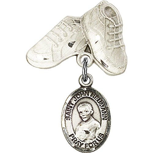 -. Title : Sterling Silver Baby Badge with St. John Neumann Charm and Baby Boots Pin 1 X 5/8 inches