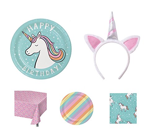 -. Feature : Ultimate Unicorn Party Pack for 10 or More Guests! / Includes: 10ct dinner plates, 10 ct dessert plates, 20 ct large napkins, 84x54" table cover, and an adorable Unicorn Headband! / Sure to impress any unicorn lover, young and old alike!