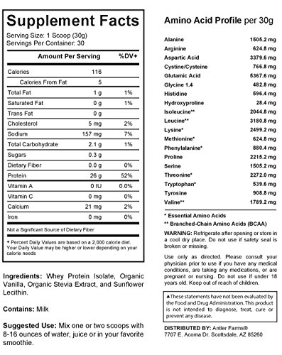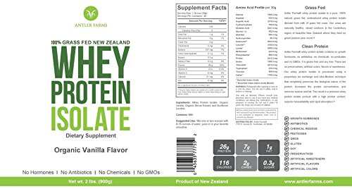 -. Feature : 100% GRASS FED - Antler Farms® Whey Protein Isolate comes from naturally robust and healthy grass fed cows. Most commercial whey protein products are derived from milk of grain fed, factory farmed cows. Grain fed cows have a proven higher incidence of disease. / PASTURE RAISED - Our cows are raised in the beautiful Canterbury Plains of New Zealand, where they feed on green pasture year round. Our cows live outdoors, where they should be. They are never confined to crowded, dirty feed lots. / HIGH PROTEIN CONTENT - Antler Farms® Whey Protein Isolate contains 26g of pure, high quality whey protein isolate per serving with high bioavailability and rapid absorption. Our cold processing preserves the biological nature of protein (undenatured), increases the protein concentration, and removes lactose and fat. / ALL NATURAL INGREDIENTS - Our great tasting whey protein isolate uses only the best source of protein and other all natural ingredients: whey protein isolate, organic vanilla, organic stevia leaf extract and non GMO sunflower lecithin. There are absolutely no fillers, artificial colors, flavors, or sweeteners. / PURE, CLEAN PROTEIN - Antler Farms® Whey Protein Isolate a light, ultra clean protein powder. No growth hormones, antibiotics, chemical residue or GMOs. It is gluten free and soy free, and screened for biological impurities such as E.coli, yeast, mold and salmonella.