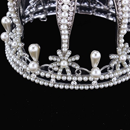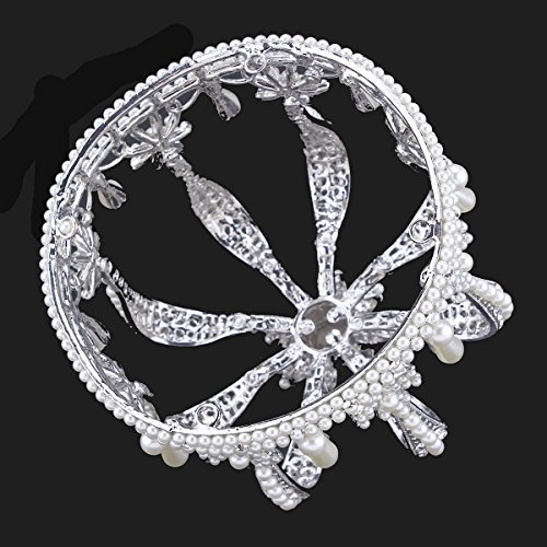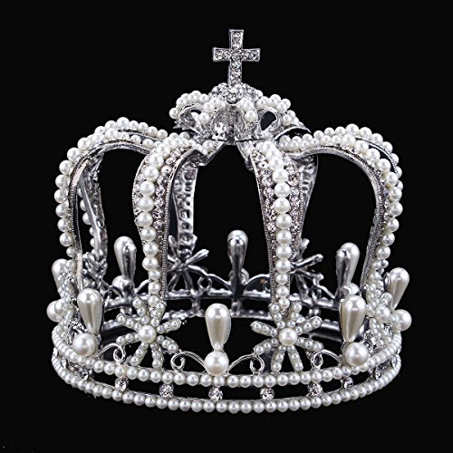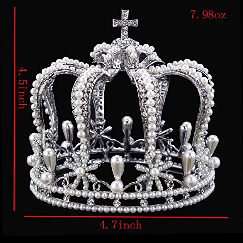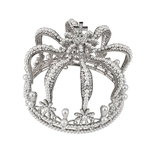 Santfe 4.7" Bottom Wide Royal Cross Style Crystal Faux Pearl Mini Full Crown Silver Plated Princess Queen Headband (Silver-a)