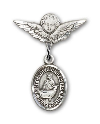 (Religious Obsession)/Baby Stationery/Stationery Sets/DIRECT FROM USA/ReligiousObsession's Sterling Silver Baby Badge with St. Catherine of Sweden Charm and Angel wi...