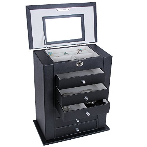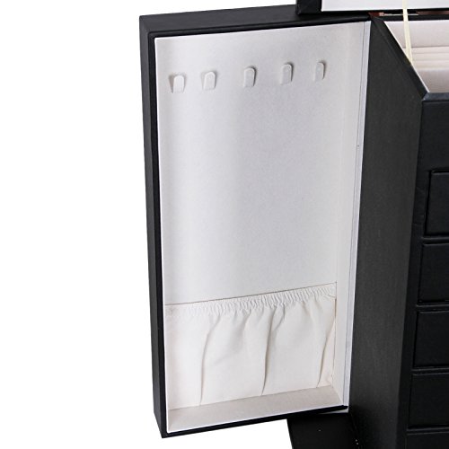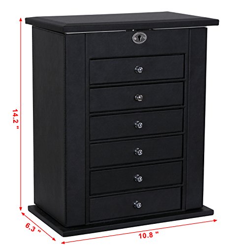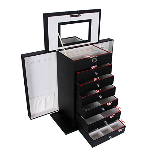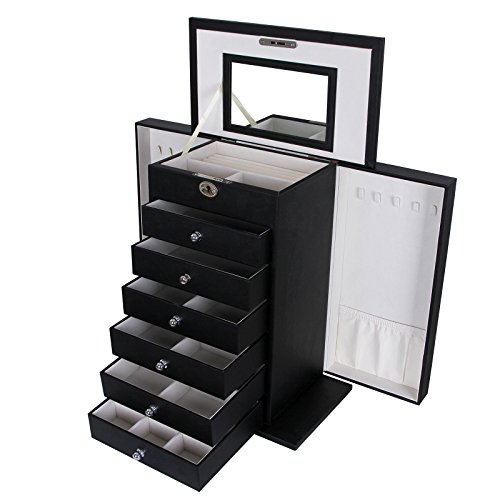 -. Feature : 7 LAYERS & MIRROR -- With 6 versatile pull out drawers, the jewelry box is sure to meet your needs, the interior mirror makes it easier to dress yourself / 2 SIDE COMPARTMENTS -- 2 hidden side compartments, including 10 hooks and 2 pockets, help to keep your necklaces from getting tangled / LARGE & MULTIPURPOSE -- Large enough to hold your necklaces, bracelets, rings, earrings, cuff links, chains, brooches and other jewelry / RIBBON ATTACHED & LOCK WITH KEY -- The lid has a ribbon attached to keep it from falling back, lock with a key adds elegance and security / ELEGANT & DURABLE -- Attractive appearance with black faux leather surface and cream velvet lining