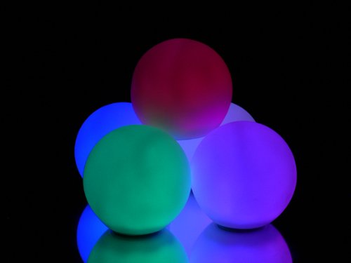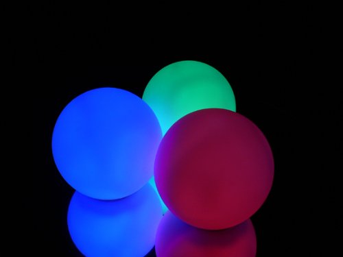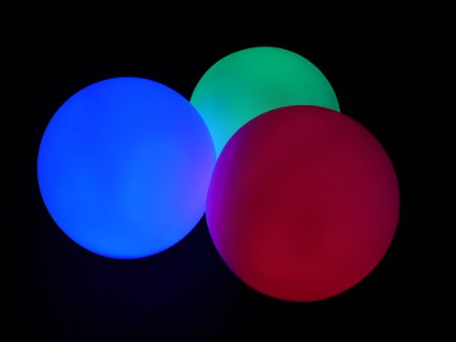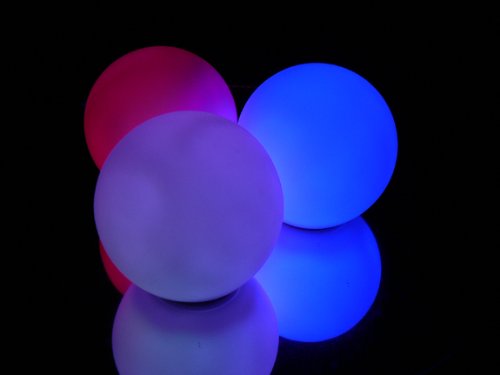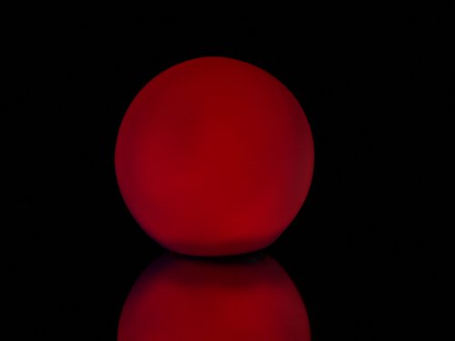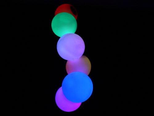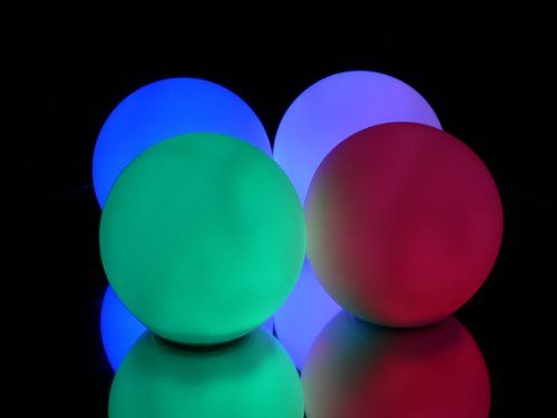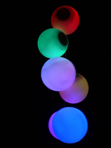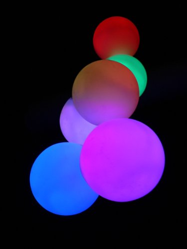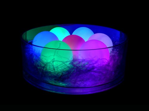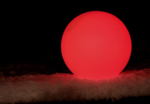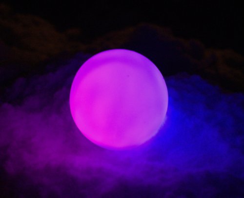 The Fortune Products R-ORB rainbow orb LED light can float in water, contains red, green, and blue LEDs, and can be used in a pool, fish bowl, or water feature as a decoration. Eight color-changing modes allow the light to rotate through colors or display a color of choice. A flat edge helps prevent the orb light from rolling away when placed on a flat surface. A loop on the bottom of the light allows it to be hung or anchored using a thin string or wire. The light can run for up to 6 hours on two CR2032 lithium button cell batteries (included). The orb light measures 3-1/4" in diameter.