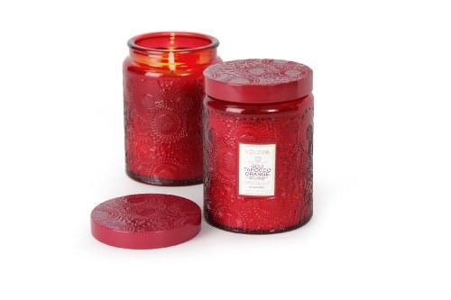 -. Feature : Candle in Large Embossed Jar Glass Candle with Metal Lid / Size: 16 oz / Approximately 100 Hours Burn time / Fragrance Notes: A blend of Ripe Tarocco Orange peel & Goji Berries