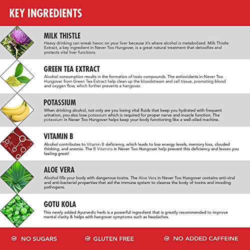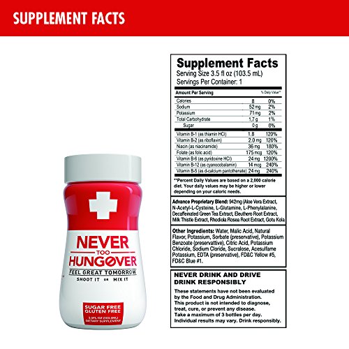 -. Feature : Comprised of a natural vitamin blend, antioxidants, amino acids, nutrients, and minerals. Key ingredients include Vitamin B, Potassium, Aloe Vera, Green Tea Extract, Gotu Kola Extract and Milk Thistle. / NEVER TOO HUNGOVER works by neutralizing and processing toxins created by alcohol in the liver and kidneys. / Sugar Free, Gluten Free & No Added Caffeine / Delicious sweet citrus flavor / Shoot it or Mix it